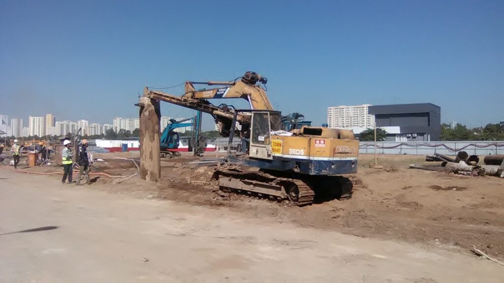 Trong các bước thi công khoan cọc thì đối với bước này, việc thực hiện yêu cầu tay nghề khá cao khi phải dùng máy rung để đằm xuống và rút ống lên một cách từ từ.